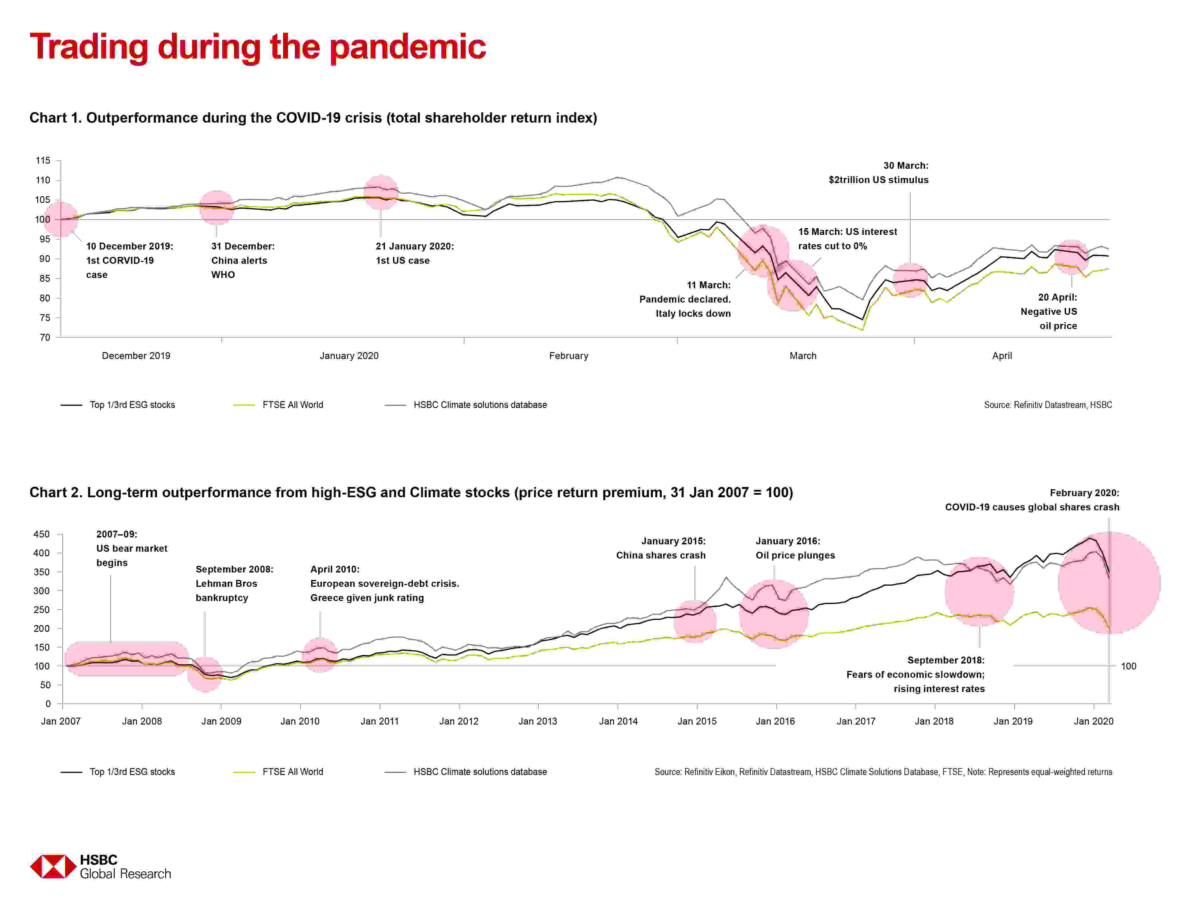Financial markets were extremely volatile as coronavirus spread globally, but in the early months of the pandemic, climate-related stocks and shares in companies with high ratings for environmental, social and governance have outperformed other equity investments.
